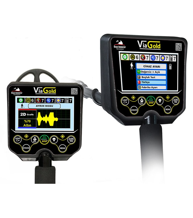 Via Gold metal dedektörü altın objeler ve hazneler 2D canlı ve sayısal değer ekranındaki özel yazılım ve tasarımı sayesinde yüksek oranda altın, gümüş, bakır gibi değerli ve değersiz metallerden ayrımını yapabilmektedir.